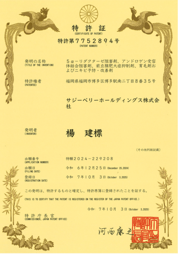 サジーに含まれる成分に関する、5α-リダクターゼ阻害剤、アンドロゲン受容体結合阻害剤、前立腺肥大症抑制剤、育毛剤およびニキビ予防・改善剤の特許が公開されました。